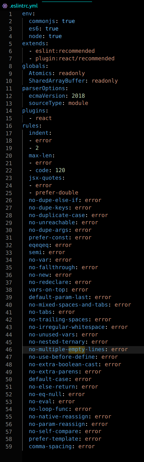 The simple workaround for this is to rename your config to.eslintrc.js , and then do the following:.. Eslint with its default parser does not support class fields syntax for now. Atomics in ecmascript 2017 spec : The simple workaround for this is to rename your config to.eslintrc.js , and then do the following: 25.10.2019 · setting project in parseroptions to false naturally reduces the time to an average of 27 seconds. When i type npm run eslint. It is not possible to invoke the atomics object as a function. 11.02.2019 · for the above reasons, i doubt that eslint will ever pass the config path for the above reasons. 11.02.2019 · for the above reasons, i doubt that eslint will ever pass the config path for the above reasons.